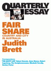 In Fair Share, Judith Brett argues that our federation was built on the idea of a big country and a fair share, no matter where one lived. We also looked to the bush for our legends and we still look to it for our food. These are not things we can just abandon. In late 2010, with the country independents deciding who would form federal government, it seemed that rural and regional Australia’s time had come again. But, as Murray-Darling water reform shows, the politics of dependence are complicated. The question remains: what will be the fate of the country in an era of user-pays, water cutbacks, climate change, droughts and flooding rains? What are the prospects for a new compact between country and city in Australia in the twenty-first century?