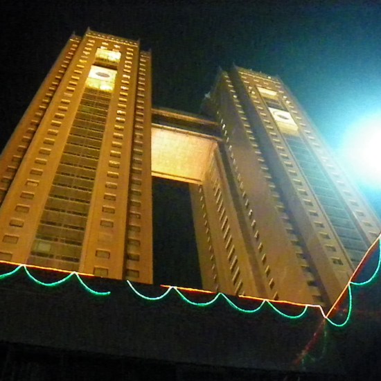 The famous Ryugyong Hotel, towering above the Pyongyang skyline. Construction on the hotel began in 1992 but was halted for over a decade due to North Korea’s economic problems. It is now nearing completion