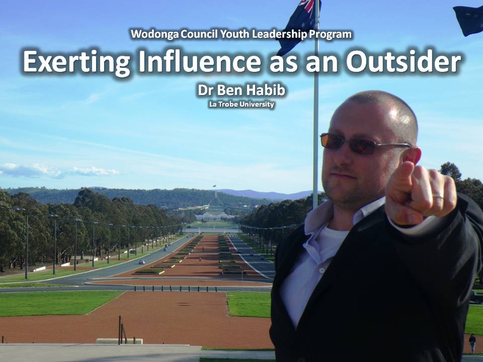 On Wednesday 29th August 2012 I was invited to give a presentation to talented local young people in the Wodonga Council Youth Leadership Program on the topic of influencing large organisations as an outsider. The talk covered the concepts of power and leverage, the pro’s and con’s of trying to influence an organisation from within as opposed to from outside, contrasting the different levels of leverage and freedom of action open to both.