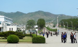 Pedestrians walking adjacent to Pohanng Square in Chongjin.