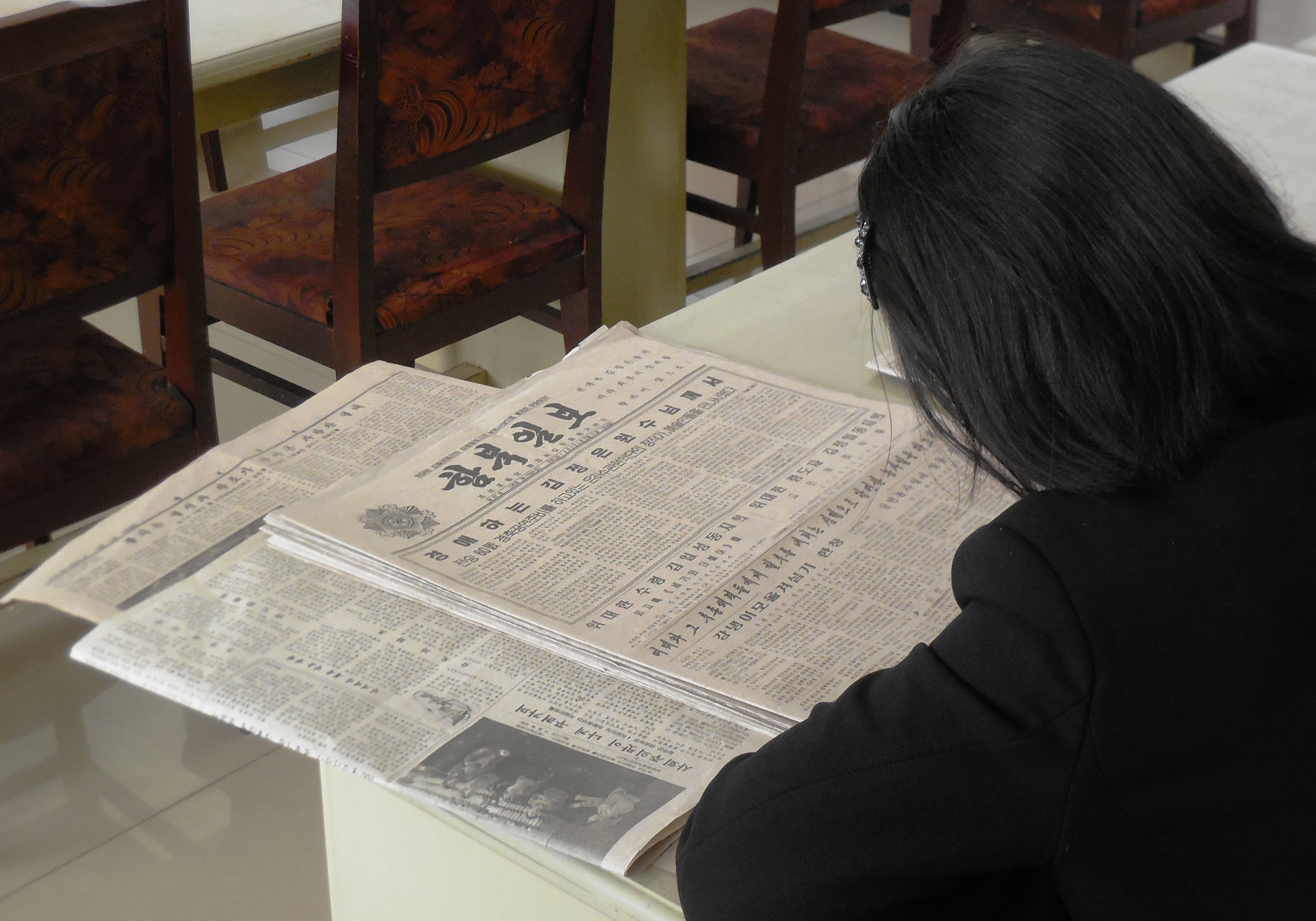 Reading Rodong Sinmun in the Chongjin Grand People’s Study House.