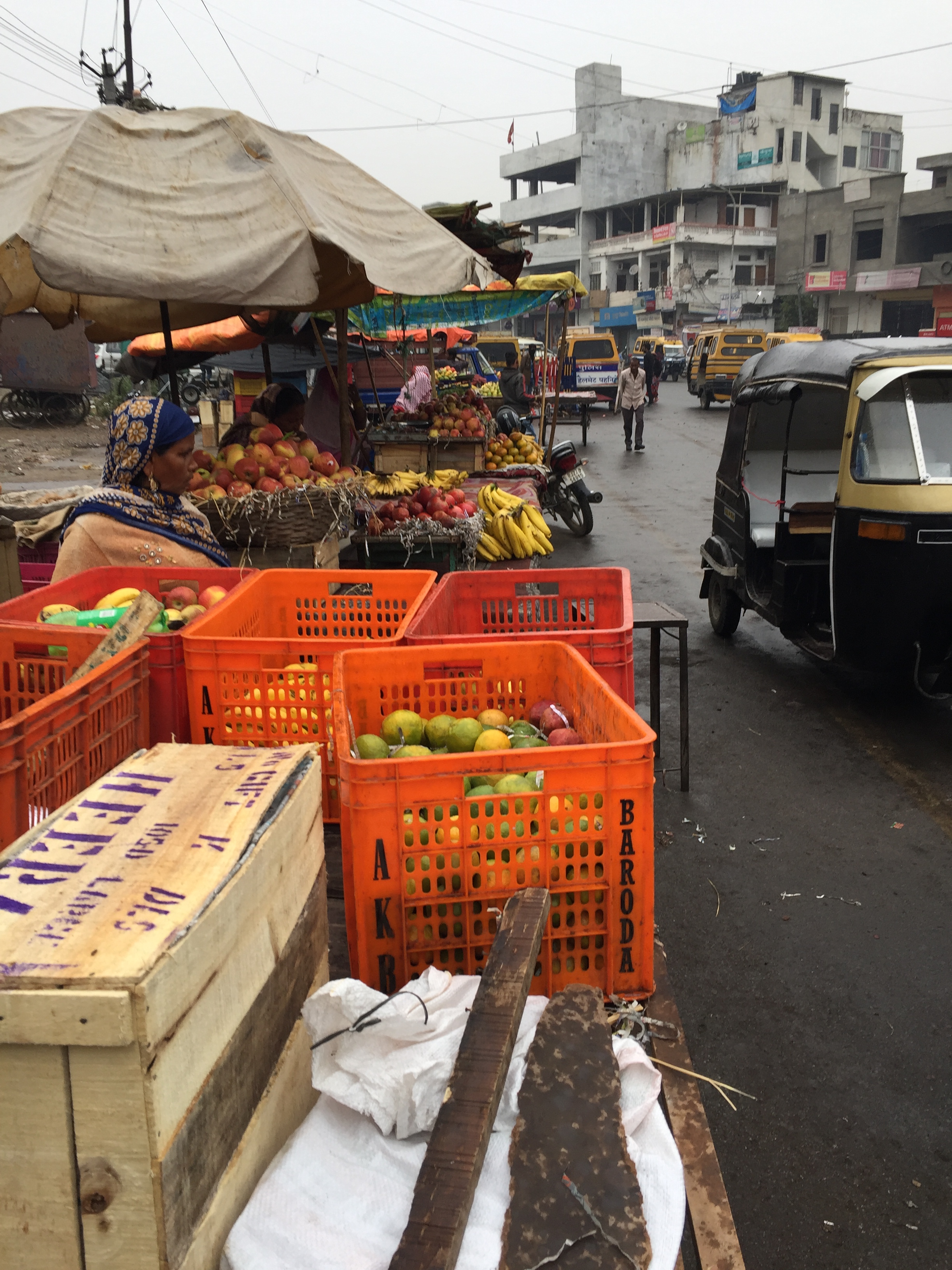 Market vendors and auto-rickshaws.