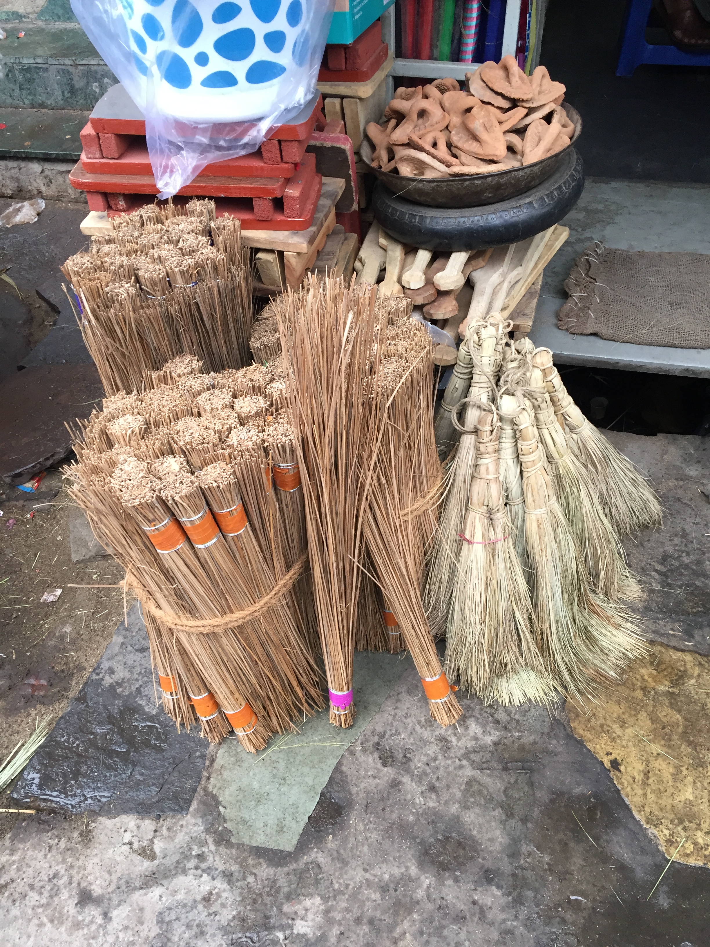 Different types of hand-made brooms.