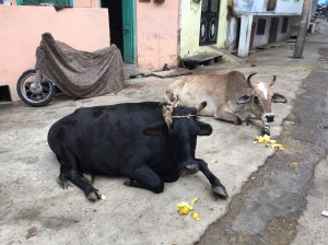 Bovine friends enjoying our banana skin scraps.