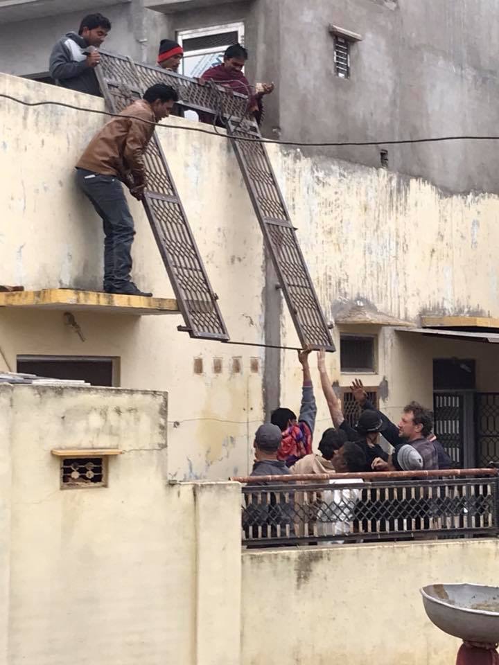 Helping hoist the iron frame.