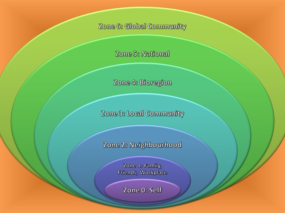 Social permaculture draws on the permaculture ethics and design principles to create regenerative social relationships and communities. Social permaculture zones can be visualised as a set of concentric rings symbolising social and community relationships at different scales, from the inner landscape of the individual through to the global level.