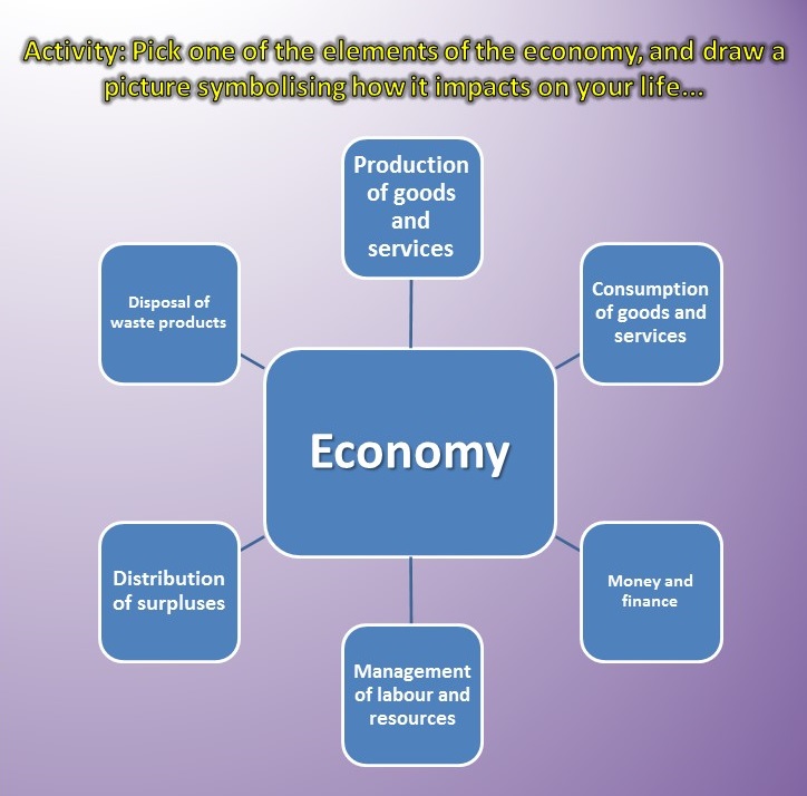 First, the group brainstorms definitions and features of the economy, which we collate on a whiteboard. Next, we explore the groups responses in relation to the six elements of the economy illustrated in the diagram below.