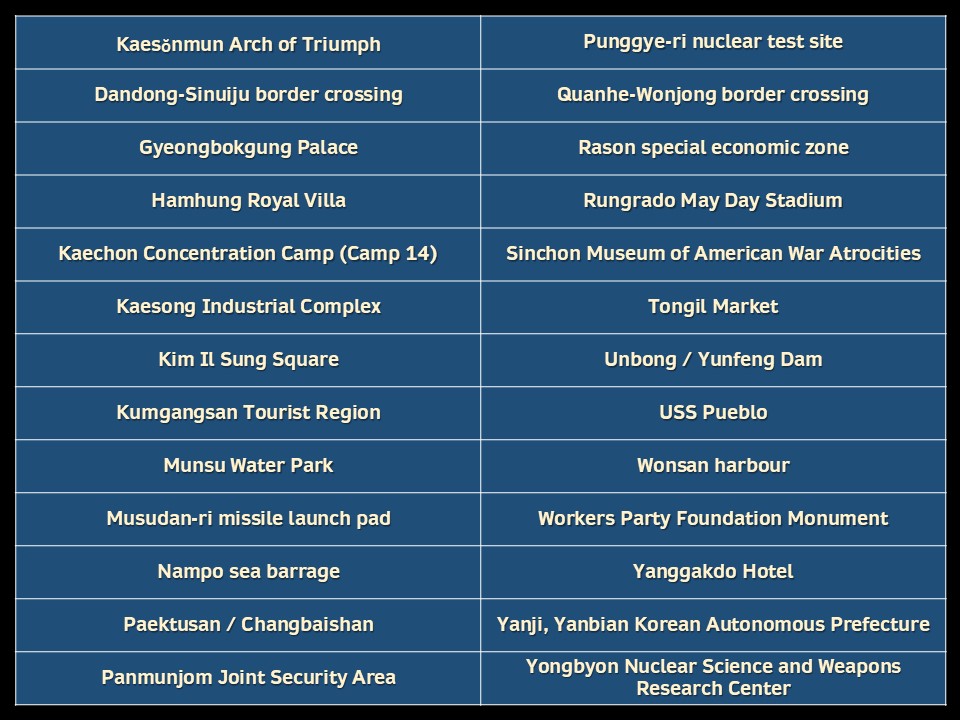 - Explain why each site is significant, in the context of what we have learned about North Korea over the course of the subject.