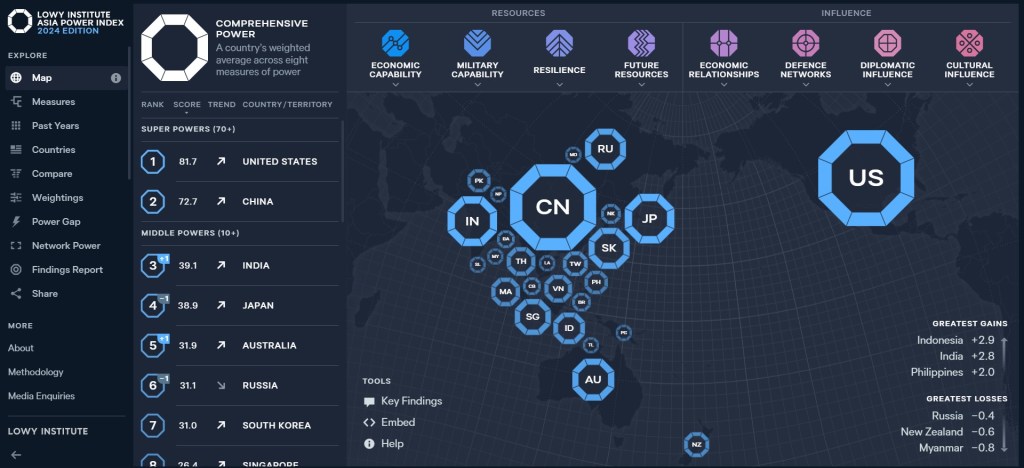 At the heart of the course is a focus on applying International Relations theory and analytical frameworks to real-world data. One particularly valuable resource is the Lowy Asia Power Index, produced by the Lowy Institute, which offers comprehensive, data-driven insights into the distribution of power in the region. By interrogating the Index’s eight measures of power, students are encouraged to develop a more comprehensive understanding of the region’s strategic landscape.
