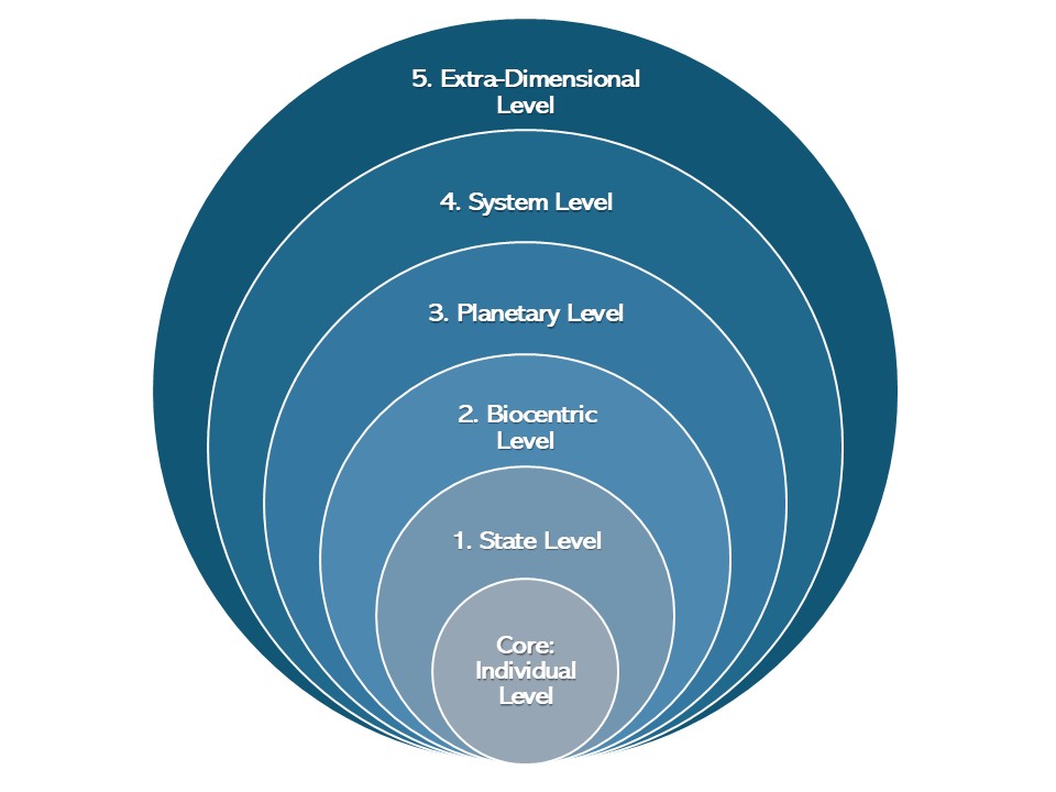 This level addresses the broader system of interactions among human and non-human entities, including extraterrestrial civilisations and cosmic phenomena. It acknowledges the interdependence of planetary, biocentric, and state-level interactions within a larger cosmic framework.